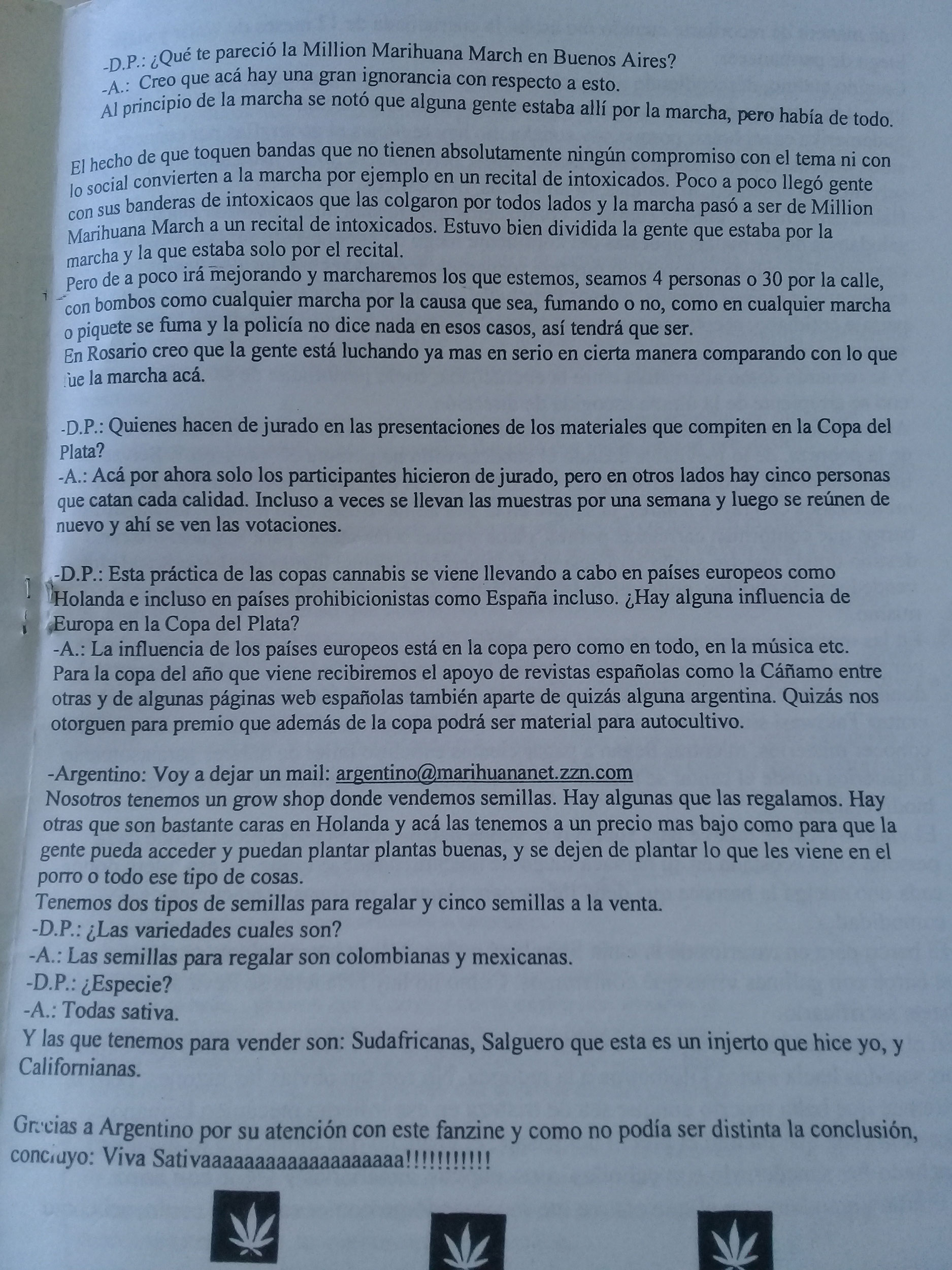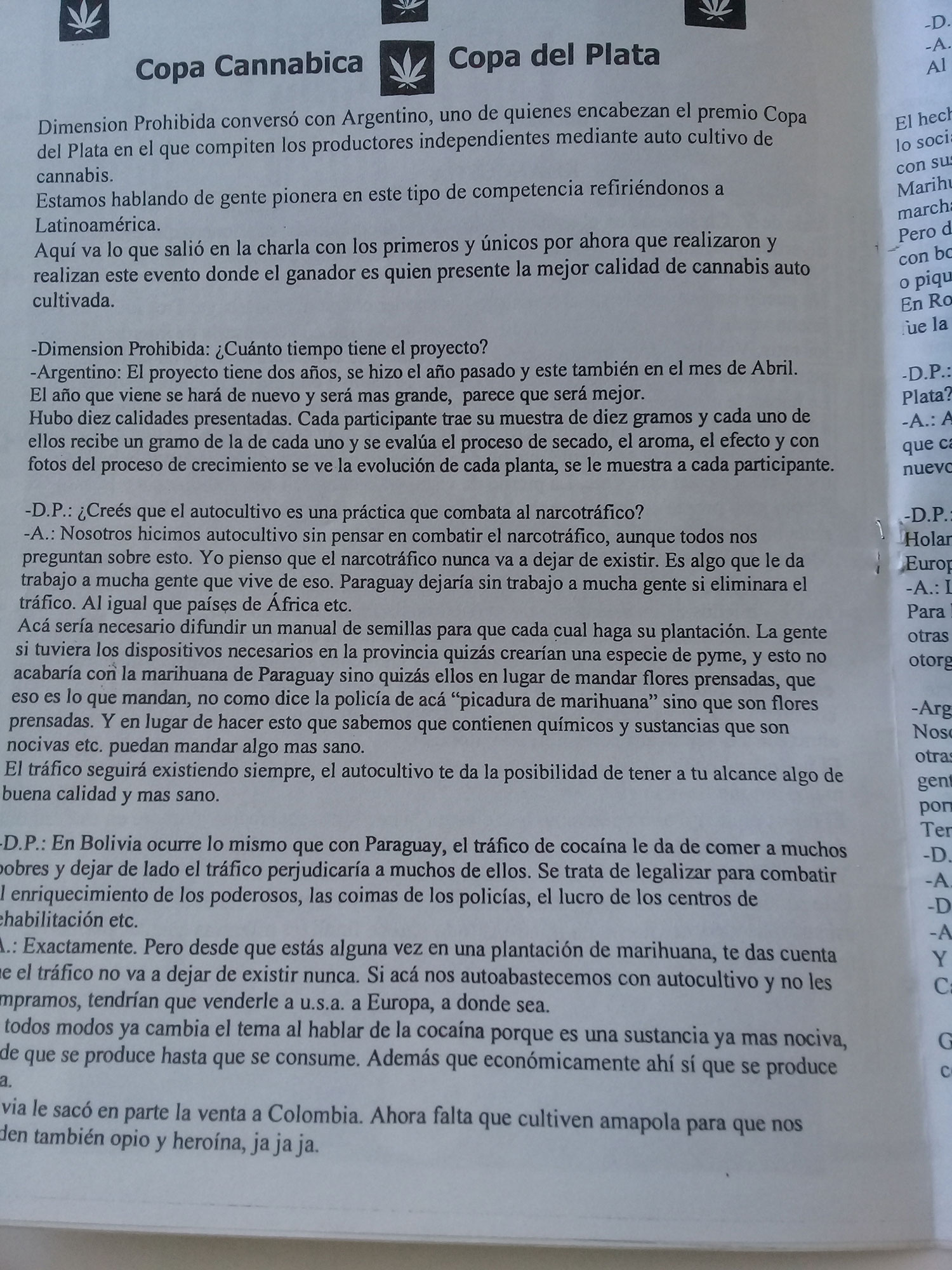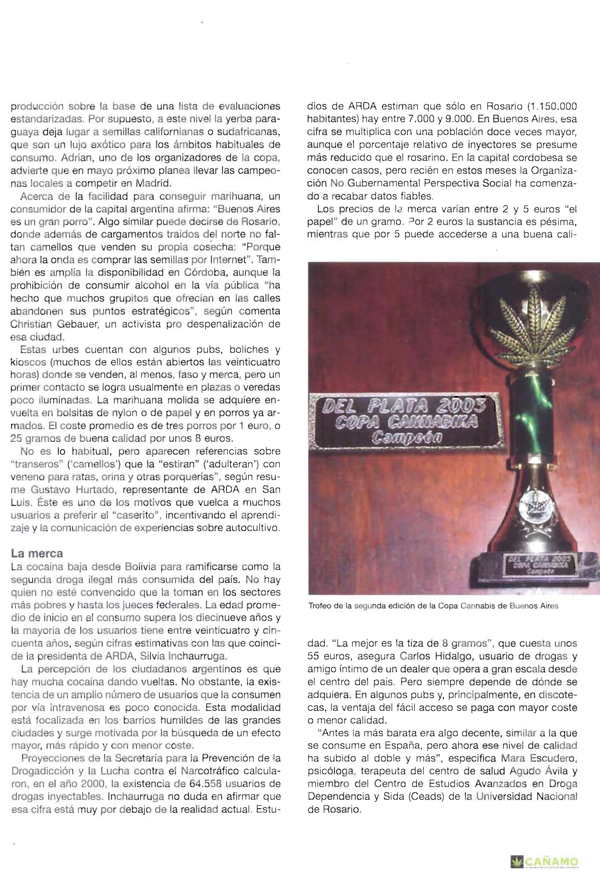 La Copa Cannábica Del Plata comienza como una juntada entre amigos a fumar sus muestras y lo que tenia cada año, pero siempre estaba la pelea de que la mía era la mejor eso decía cada competidor hasta que se decidió poner un jurado y hacer las cosas mas serias, sumarle un trofeo pero los jurados seguíamos siendo nosotros los competidores lo que terminaba siempre en discusión, se llevo en ese año 2003 la Copa Carne Kruda un amigo del barrio con una variedad Ssudafricana y asi fue que se pensó en poner jurado de afuera gente que no conozca a los competidores y en el 2004 llame a amigos de la facultad para que me ayuden en la organización y como jurados pero la respuesta en ese año fue que estaban todos buenas pero había una que se destacaba por encima de todas y esa era la White Russian de Pochoclo. Así que la decisión fue rápida. Para ese año tuvimos ya varios stands algunos talleres y charlas como el stand de Cahuinadencul de Cocho un muchacho de Olavarría que vendía plantas mágicas y misteriosas como también sus extractos, y una de las charlas fue la de Sam de ARDA que nos ponía al tanto de como estaba la ley y donde estabamos parados, para entonces creíamos que estábamos cerca de una despenalización.